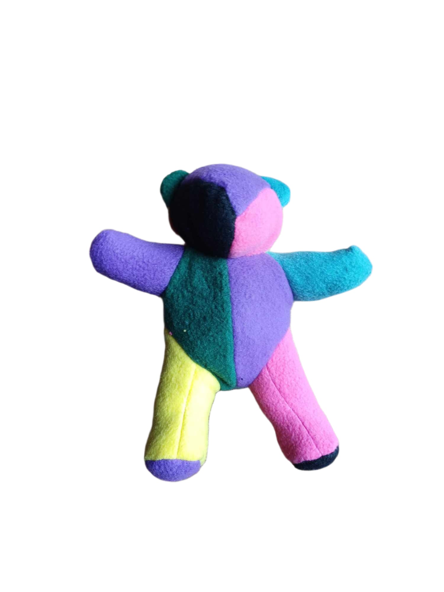 Small teddies made from our fleece scraps. Randomly put together so no bear is the same. If you'd like a specific colour combination, send us a message. Bears are roughly 7 1/2" tall.